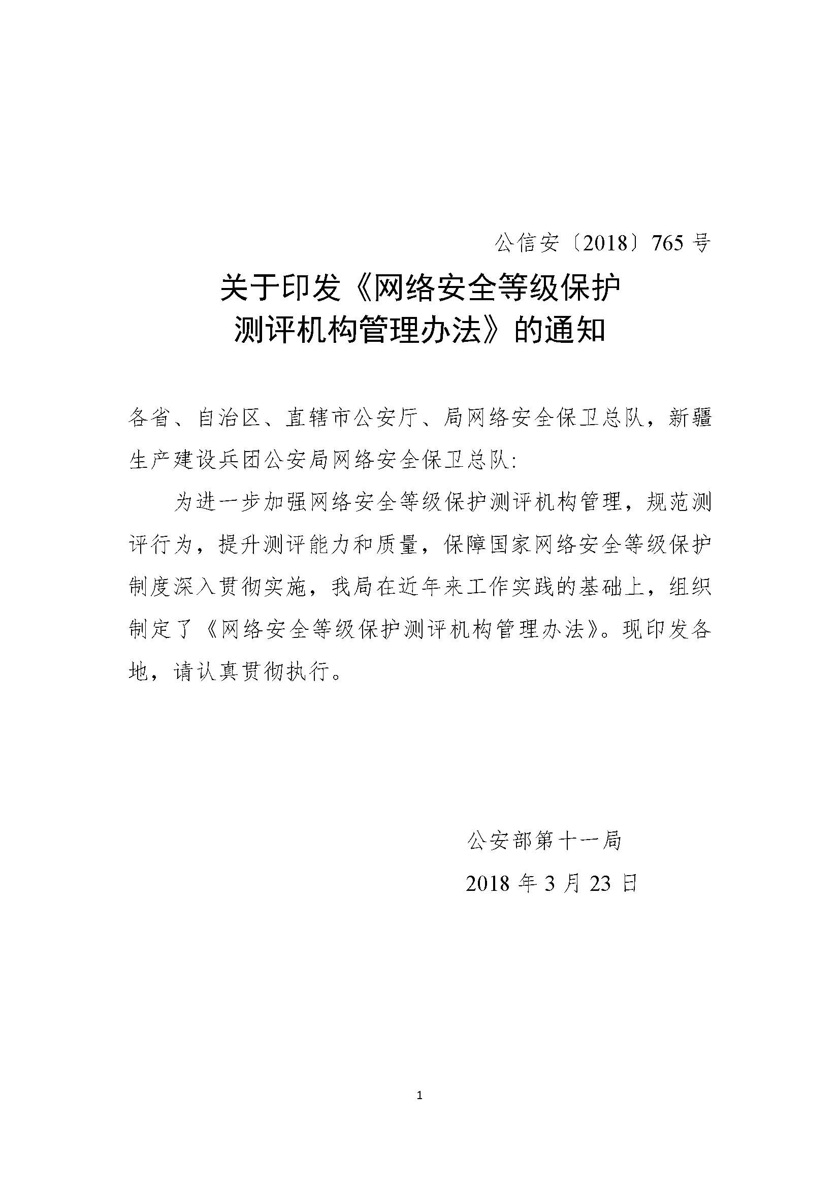 《網絡安全等級保護測評機構管理辦法》公信安〔2018〕765號